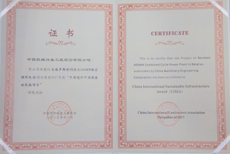 12月1日,在中国承包商会第三次全体会议上,中国对外工程承包商会对荣获“中国境外可持续基础设施建设项目”的企业颁奖,CMEC白俄别列佐夫项目荣获2017年度中国境外可持续基础设施建设项目奖,体现了在海外积极践行社会责任、践行可持续发展的责任和担当。