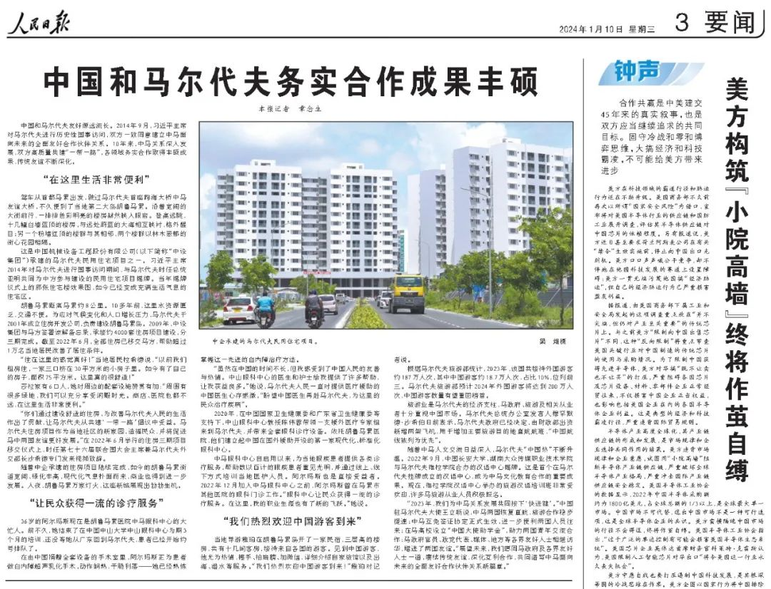 1月10日,《人民日报》发布“中国和马尔代夫务实合作成果丰硕”一文,文中特别提到,国机工程集团总部(MK网_MK(中国))承建的马尔代夫民用住宅项目,获得了当地居民的认可。
